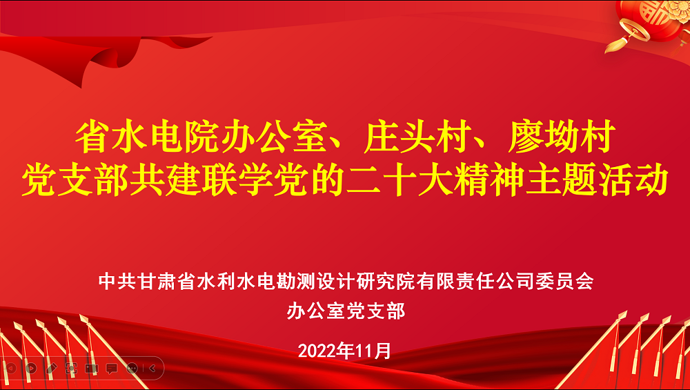 為持續(xù)促進黨的二十大精神學(xué)習(xí)貫徹走深走實,使黨的二十大精神進村入戶、深入人心,11月22日,甘肅省水利水電勘測設(shè)計研究院有限責(zé)任公司辦公室黨支部與幫扶村西峰區(qū)莊頭村黨支部、廖坳村黨支部開展共建聯(lián)學(xué)黨的二十大精神主題活動。