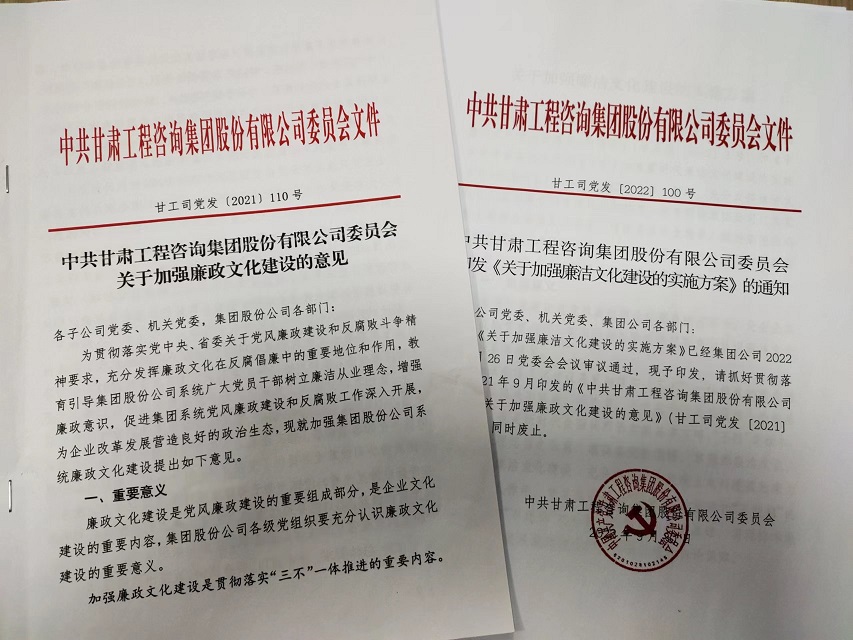 作為新組建的產(chǎn)業(yè)集團,甘肅工程咨詢集團把資產(chǎn)整合、產(chǎn)業(yè)耦合和文化融合作為集團公司組建的重要內(nèi)容,其中讓廉潔文化建設(shè)在企業(yè)文化建設(shè)中先行一步,早安排早部署,2021年9月集團公司黨委研究印發(fā)《關(guān)于加強廉政文化建設(shè)的意見》,在中共中央辦公廳《關(guān)于加強新時代廉潔文化建設(shè)的意見》和省委《實施方案》印發(fā)后,又及時對標、查缺補漏,2022年9月修訂印發(fā)《關(guān)于加強廉潔文化建設(shè)的實施方案》,為新時代集團公司加強廉潔文化建設(shè)提供了指導(dǎo)。自組建以來,集團公司廉潔文化建設(shè)力求在“內(nèi)化于心”上下功夫,在“外化于行”上求實效,引導(dǎo)干部職工廉潔從業(yè),廉潔用權(quán),積極營造“崇廉、尚廉、倡廉、守廉”的企業(yè)風(fēng)尚和發(fā)展氛圍。
