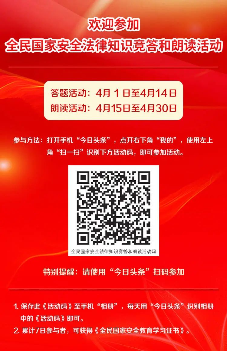 今年是國家安全法頒布施行10周年,4月15日是第十個全民國家安全教育日。為深入貫徹落實習近平總書記關(guān)于全面加強國家安全教育的重要指示批示精神,推進國家安全法治宣傳教育走深走實,增強全民國家安全意識和法治意識,倡議大家參加全民國家安全法律知識競答和朗讀活動。