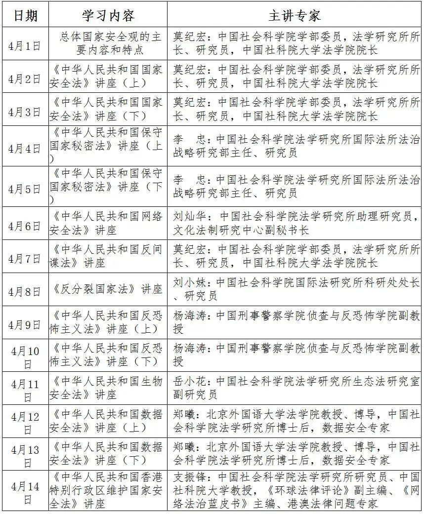 學習總體國家安全觀的主要內(nèi)容和特點、國家安全法、國防法、反分裂國家法、反間諜法、保守國家秘密法、反恐怖主義法等。朗讀法律全文。專家講座配備有競答試題。