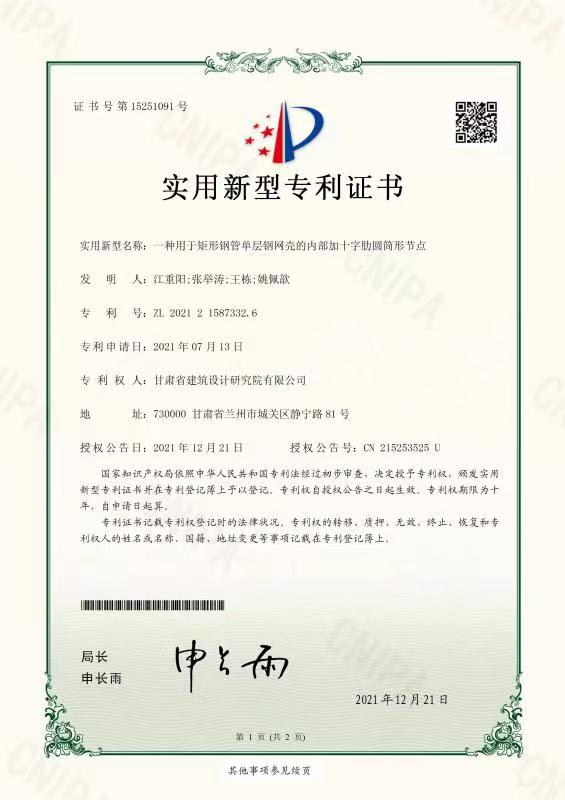 近日,從國(guó)家知識(shí)產(chǎn)權(quán)局傳來好消息,由建筑設(shè)計(jì)院總工程師張舉濤、設(shè)計(jì)四所總工程師江重陽、設(shè)計(jì)五院總工程師王棟、設(shè)計(jì)四所工程師姚佩歆聯(lián)合申報(bào)的“一種用于矩形鋼管單層鋼網(wǎng)殼的內(nèi)部加十字肋圓筒形節(jié)點(diǎn)”技術(shù),喜獲國(guó)家實(shí)用新型專利。