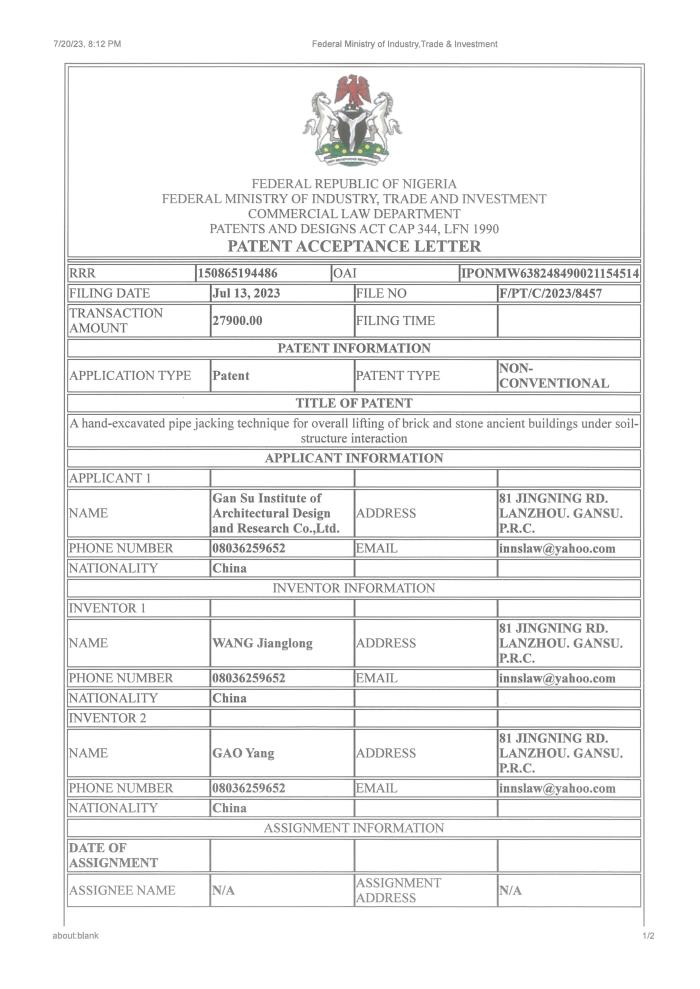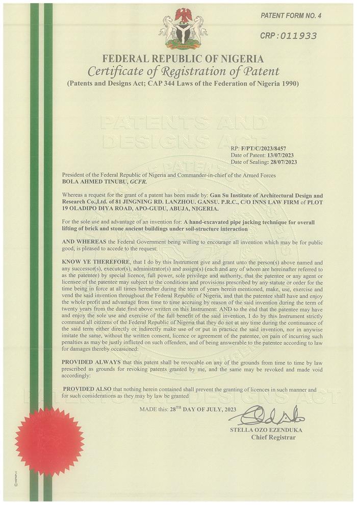 日前,非盟知識產(chǎn)權(quán)局對省建筑設(shè)計院王江龍等申報的“土-結(jié)構(gòu)相互作用下磚石結(jié)構(gòu)古建筑整體頂升手掘式頂管技術(shù)”(A hand-excavated pipe jacking technique for overall lifting of brick and stone ancient buildings under soil-structure interaction)進行授權(quán),為省建筑設(shè)計院后續(xù)承接援外項目及國外項目給予了堅實的技術(shù)支撐。