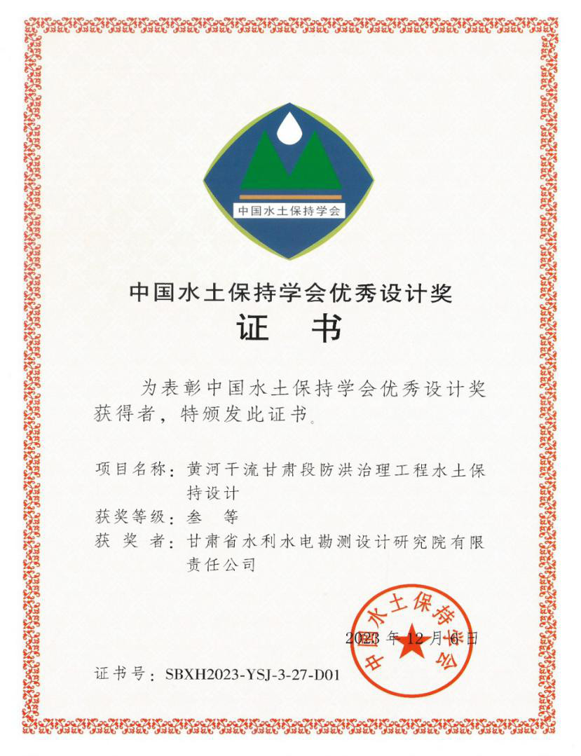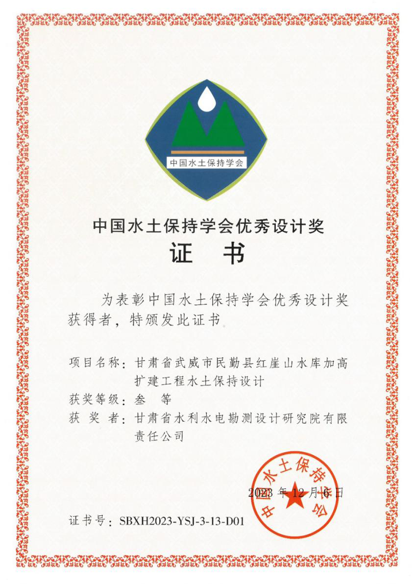 近日,第四屆中國水土保持學(xué)術(shù)大會在福建福州舉行。省水電設(shè)計院勘測設(shè)計的《武威市民勤縣紅崖山水庫加高擴(kuò)建工程水土保持設(shè)計》《黃河干流甘肅段防洪治理工程水土保持設(shè)計》兩項水土保持設(shè)計成果榮獲第四屆中國水土保持學(xué)會優(yōu)秀設(shè)計三等獎。