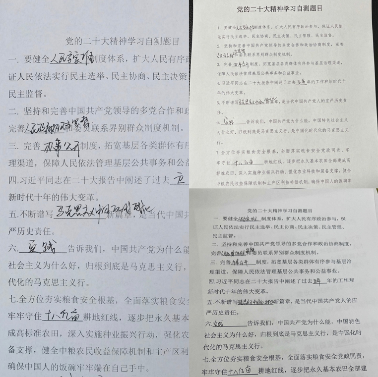 開展答卷測試,檢驗學習成效。招標咨詢集團第三黨支部所屬咨詢中心采取線上視頻會議的方式組織全體黨員居家學習黨的二十大報告原文,通過學原文、悟原理、反復學、時常悟,深刻領會和準確把握報告的精神實質(zhì)、豐富內(nèi)涵和核心要義。同時,對黨的二十大報告相關知識開展應知應會測試,通過答卷的方式檢驗黨員干部對黨的二十大精神的理解和把握,達到以考促學、以學促用、學用結合、知行合一的目的。